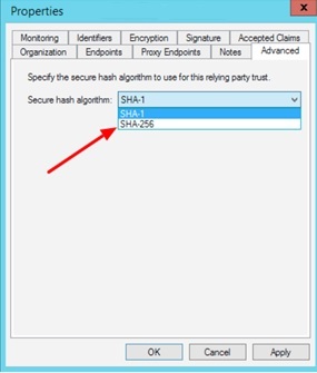 - Right-click on the Display Name in the Relying party trust and select Properties. Select the Advanced tab and select the secure hash algorithm SHA256.