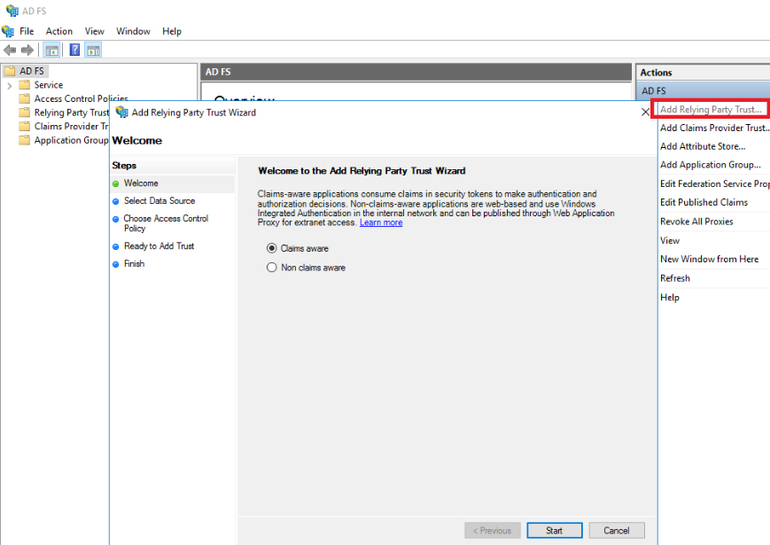- Select Add Relying Party Trust. Click on Start button to add a Claims aware Relying Party Trust.