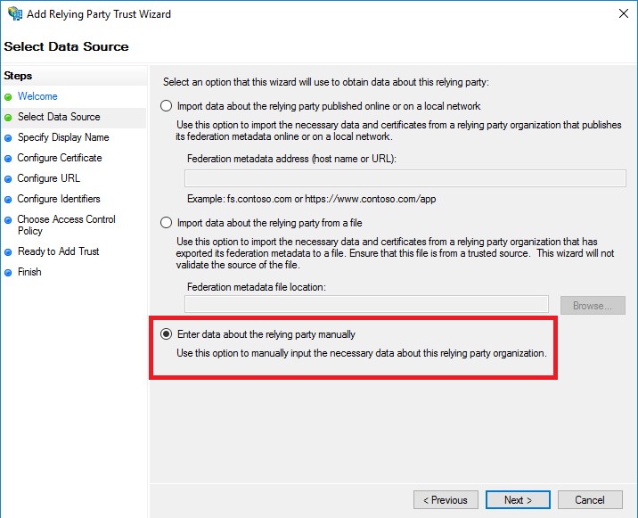 - Select “Enter data about the relying party manually”. Click on the Next button.
