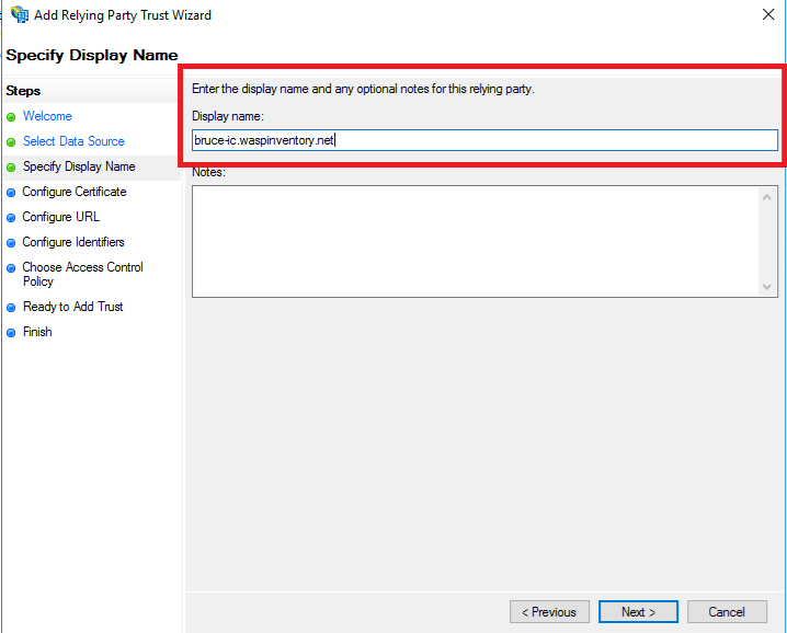 - Enter a display name for your tenant. We suggest you to add your host name cdc.waspassetinventory.com in the Display name field. Click on the Next button.