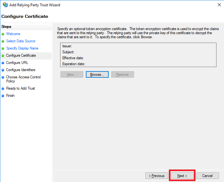- ADFS uses the SSL certificate for security. Wasp does not support additional encryption certificates beyond SSL at this time. Click on the Next button.