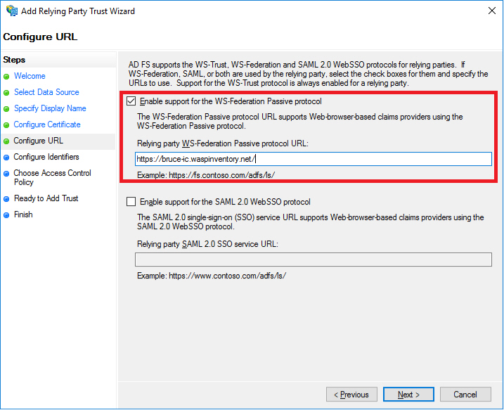 - Every Wasp tenant with the Active Directory feature supports WS-Federation Passive Protocol. The trailing slash is important. Enter your host URL https://cdc.waspinventory.com/. Click on the Next button.
