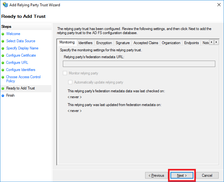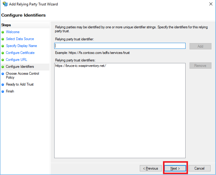 - Your tenants URL, with trailing slash is the only Relying Party trust identifier we need. Click on the Next button.