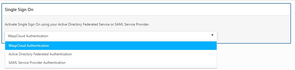 When you access the Single Sign-On Settings in the Settings menu in the InventoryCloud application, there are two options provided to activate Single Sign and they are Active Directory Federated Authentication or SAML Service Provider Authentication. WaspCloud is the default username password authentication you use when registering your user account.
