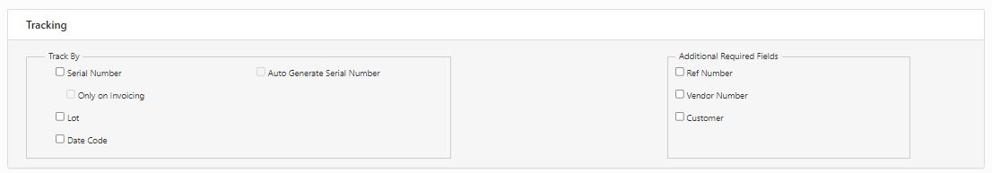 The Inventory item and an Assembly can be tracked by Serial Number, Lot, and Date. Additionally, you can also track by Reference Number, Vendor Number, and Customer. The Serial Number can be tracked "Only on Invoicing," and also the Serial Number can be auto-generated using the Auto Generate Serial Number option.