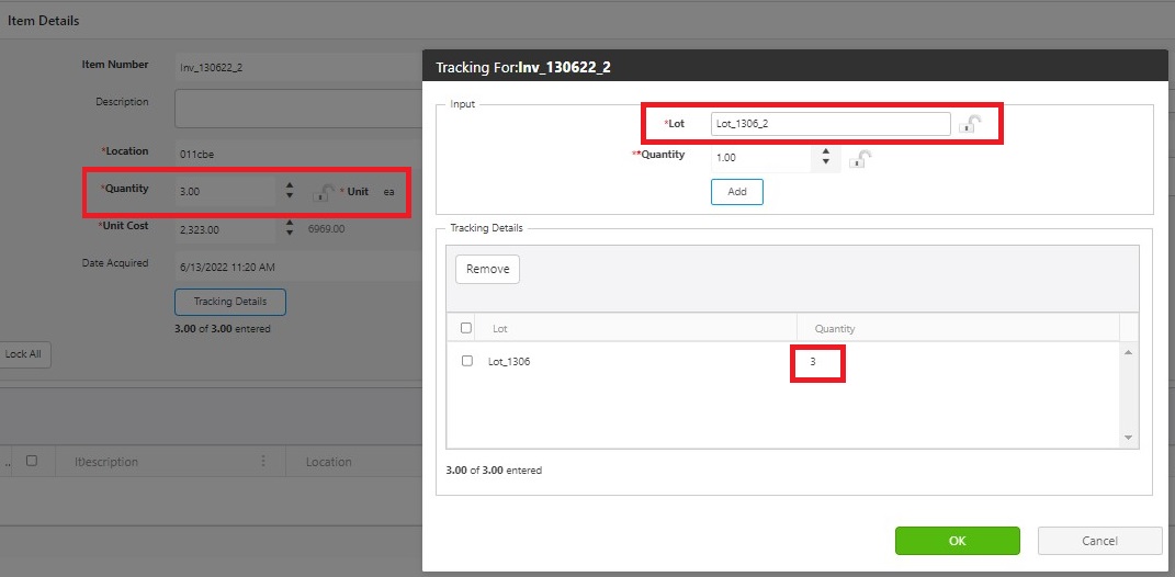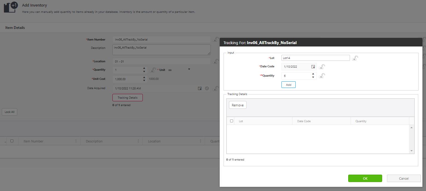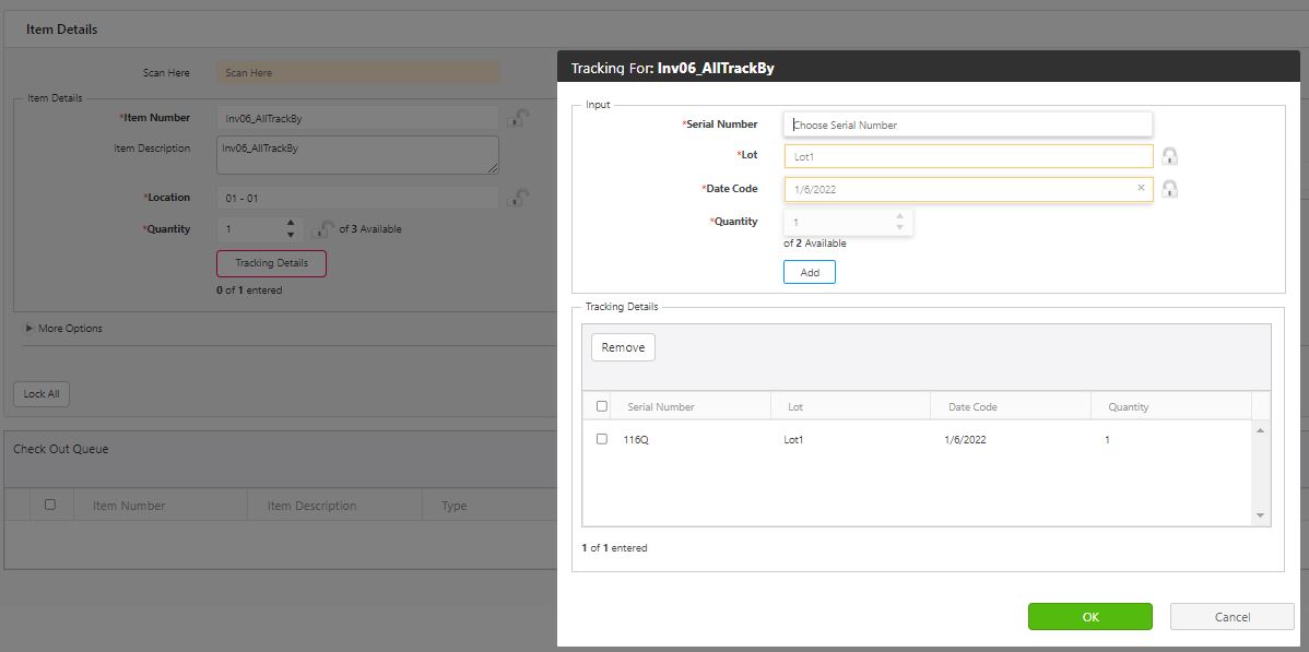 - If the inventory item is tracked by Lot and Date Code, then enter the values and click on the Add button to move the tracking details to the queue. The Quantity can be more than 1.