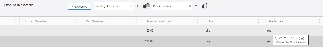 - Has Notes displays "Yes" if a note is added while performing the transaction. Hover the cursor over the Yes link to view notes.