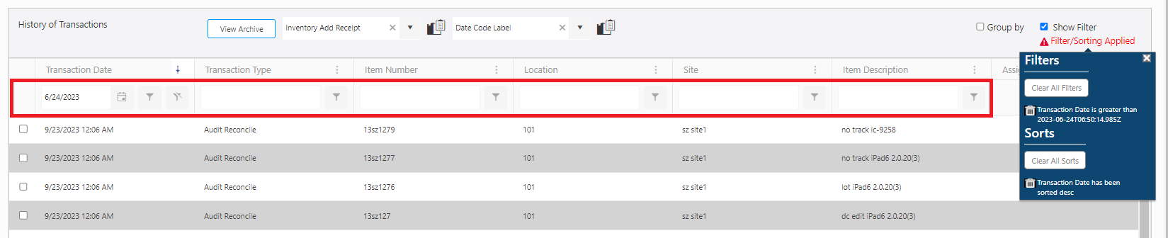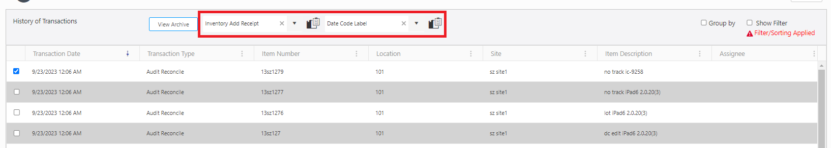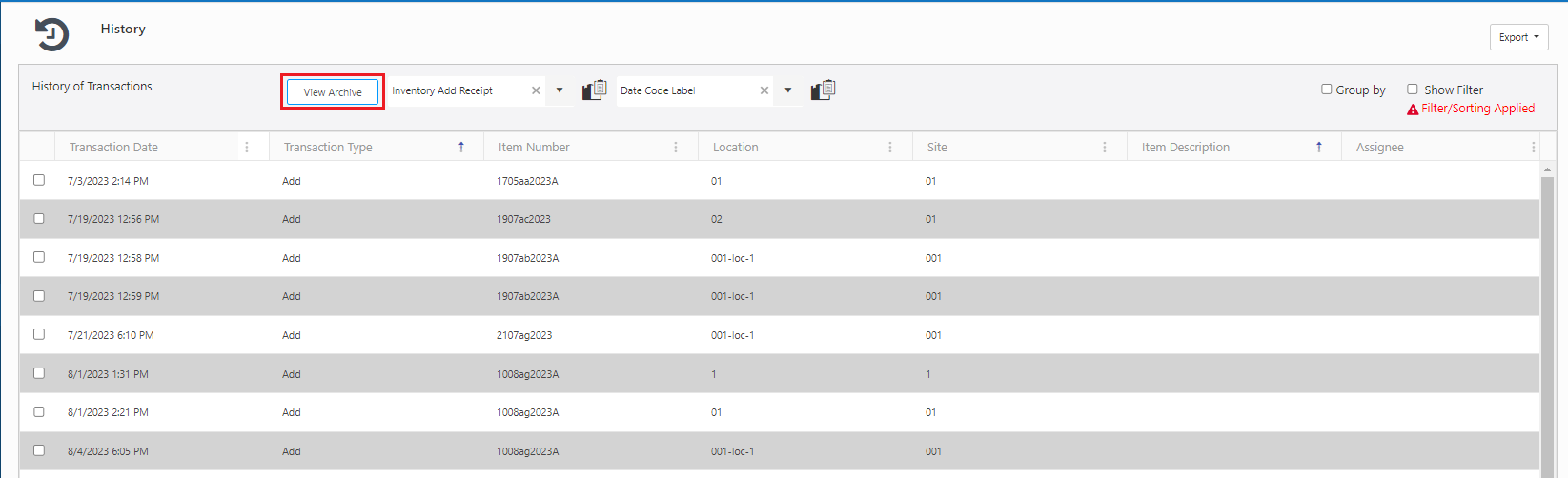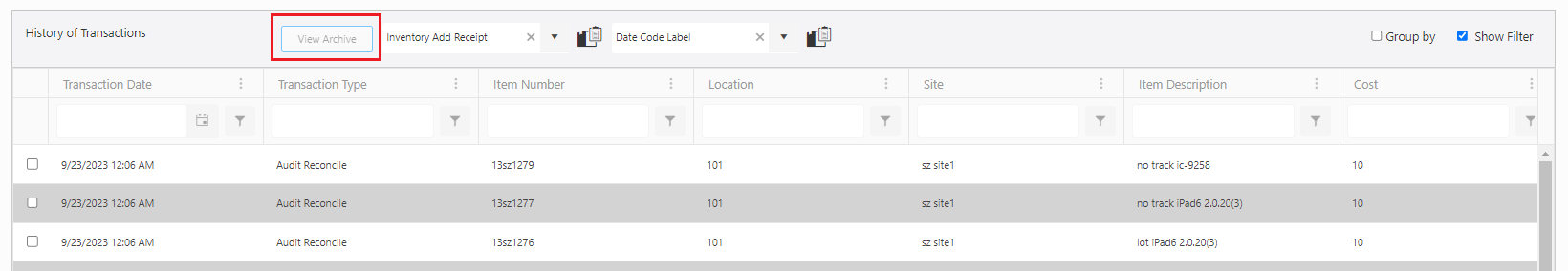- Apply the sorting and filtering on the transaction history screen. This will enable the View Archive button.