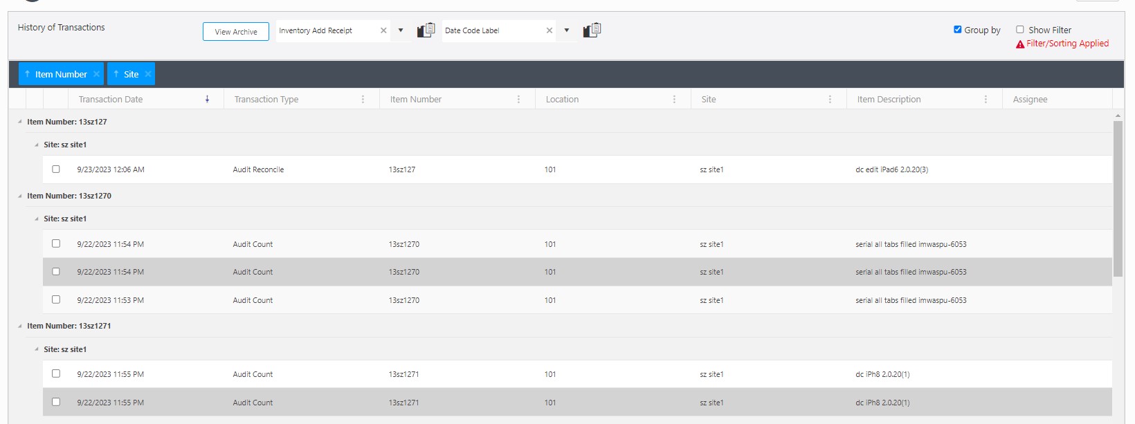 - The page will display the history of transactions based on the columns grouped by you. You can filter these items as needed.