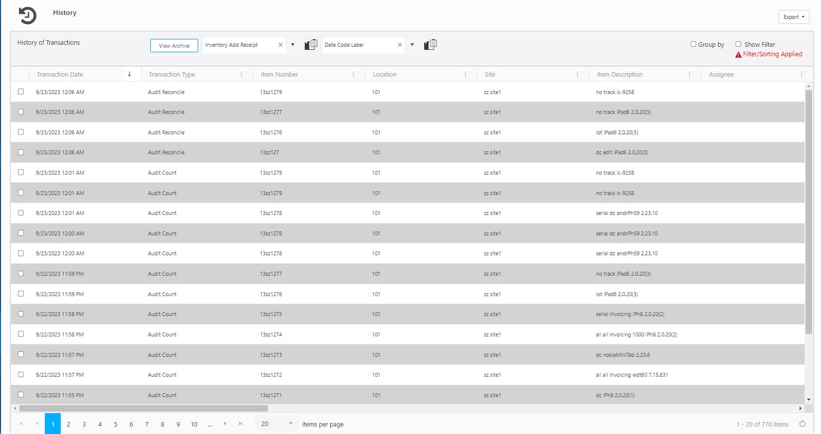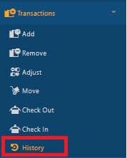 - On the History screen, you'll see info about the transaction date, type, item, location, group, and more.