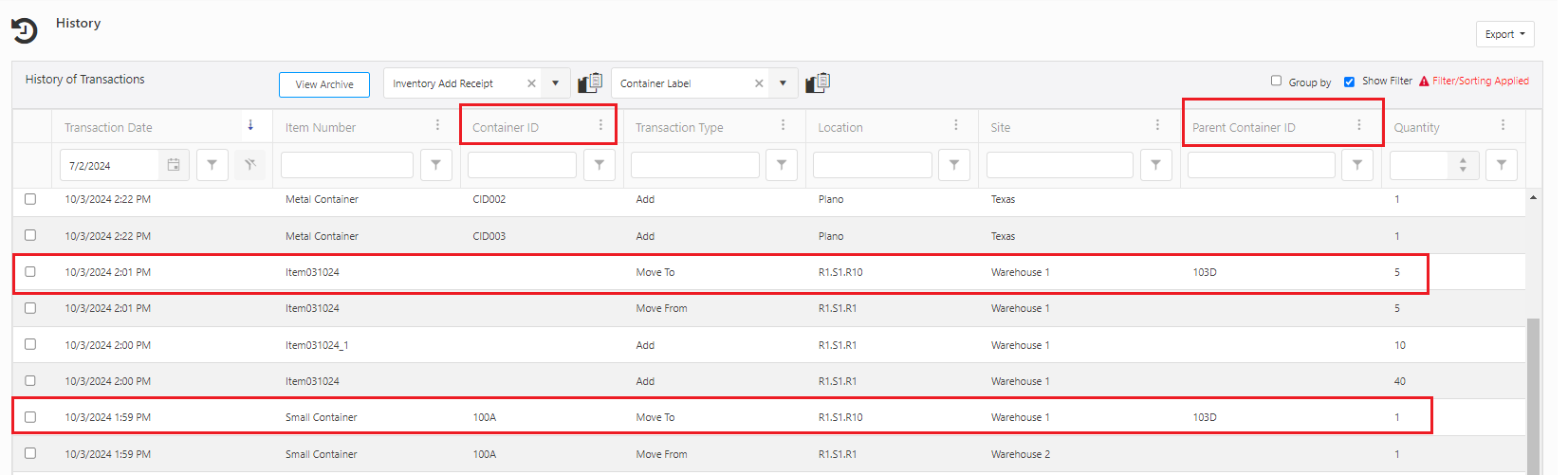 - When items are moved into a tracked container, the Transaction History shows the Parent Container ID.