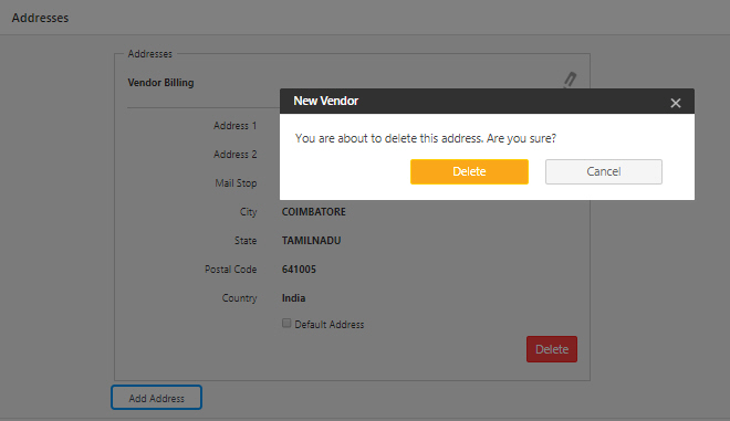 - Select the type of address in the address type field. The options are vendor billing and vendor shipping.