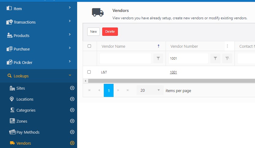 - Click on the Lookups -> Vendors. The Vendor screen will appear.
