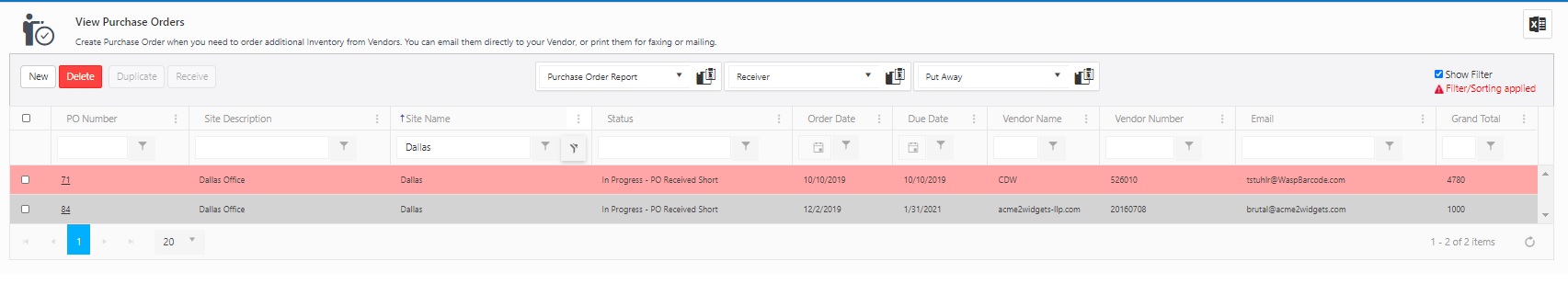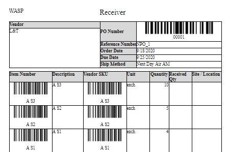 Receiver Report - Select the PO and click on the receiver report button. The report will display the item number, description, vendor, unit, quantity, received quantity, and Site/location.