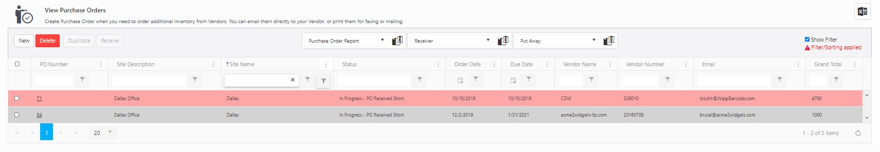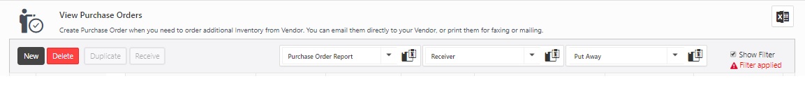 Put Away Report - Select the PO and click on the Put Away report. It will generate a report and display where the inventory will be put away or stored. The report will show the following details - Item Number (barcode), Description, Received Qty, Unit, and Site / Location.