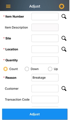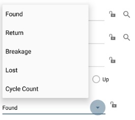 - Enter a reason for the adjustment. Options are: Found, Return, Breakage, Lost, Cycle Count. Count will display all the options, Up will display Found, Return and Cycle count and Down will display Breakage, Lost and Cycle count.